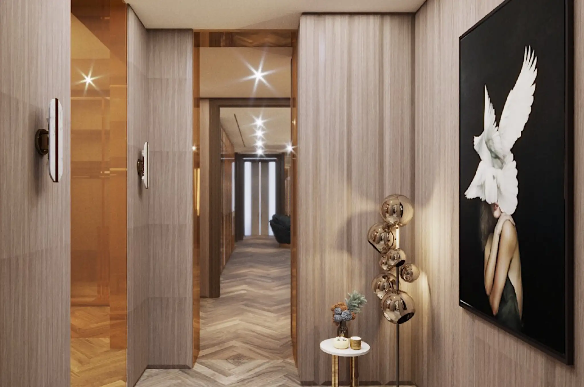 Warm wood textures meet bronze accents, creating a refined yet inviting atmosphere. The bold artwork adds personality and contrast, while sculptural lighting introduces an artistic glow that guides the way. This thoughtful curation turns a simple corridor into a gallery-like transition, connecting spaces with both function and character.