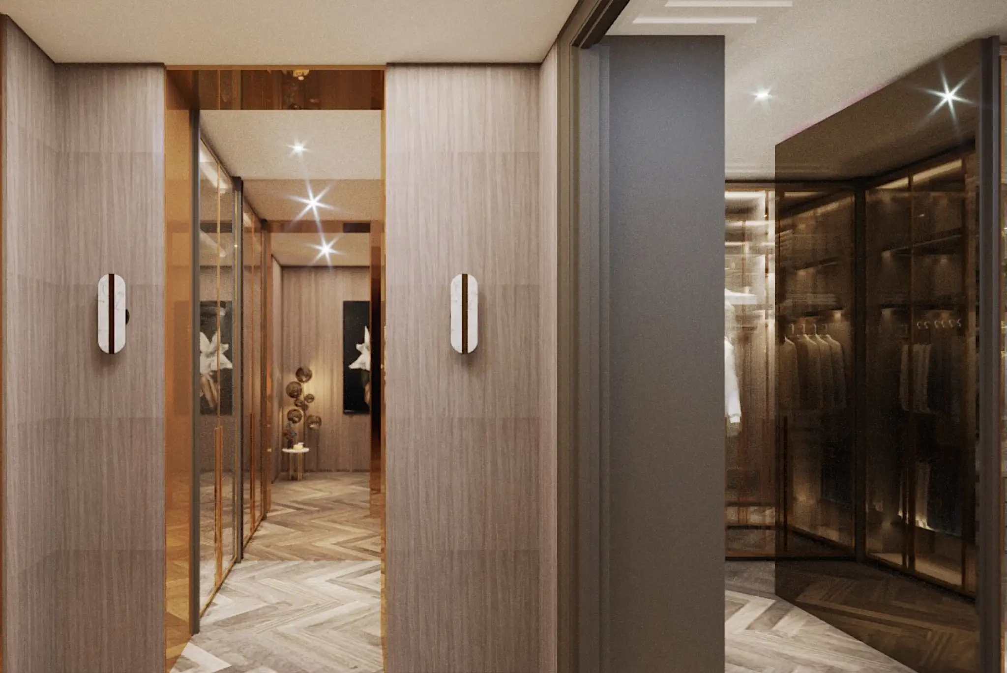 Kore developed a tailored design approach by combining custom wall finishes, curated lighting, and art integration to elevate the hallway into a feature in its own right. Every detail, from flooring pattern to reflective surfaces, was thoughtfully considered to bring depth and warmth.